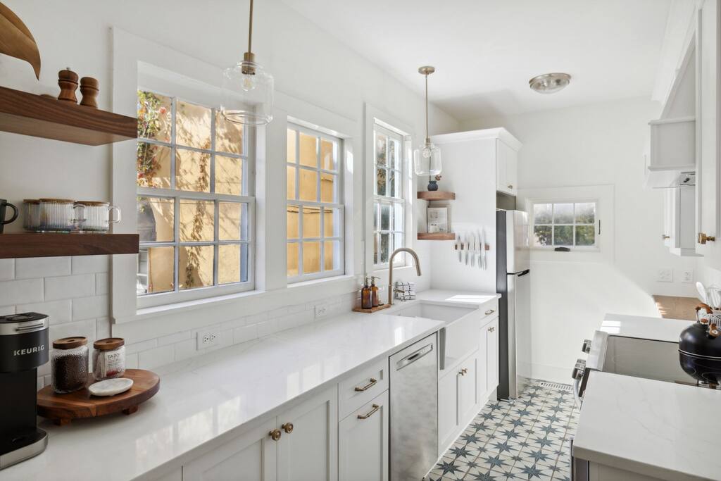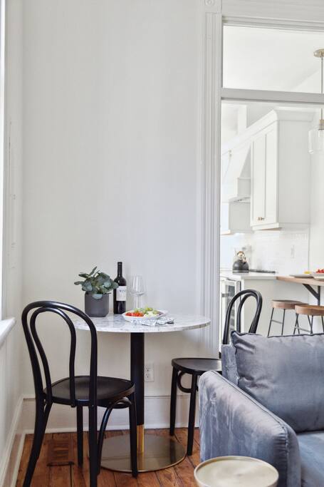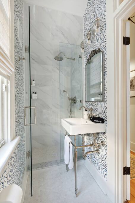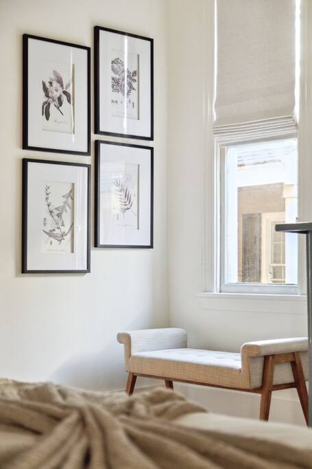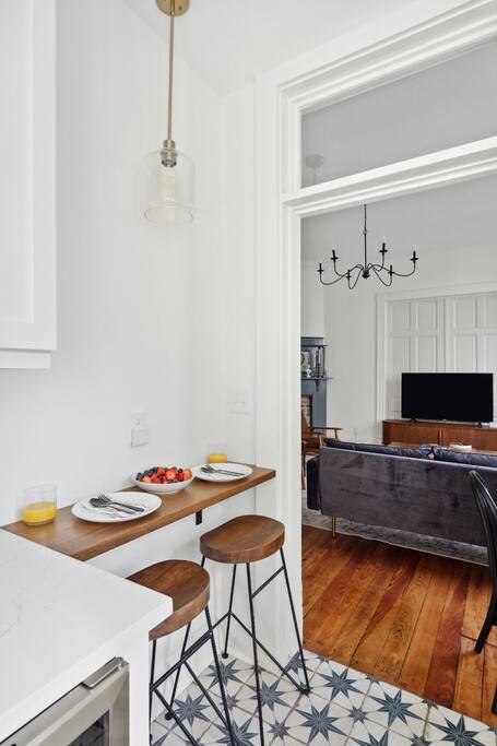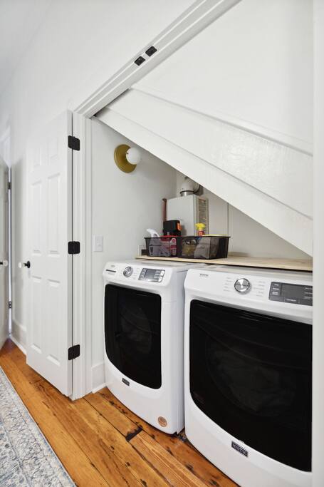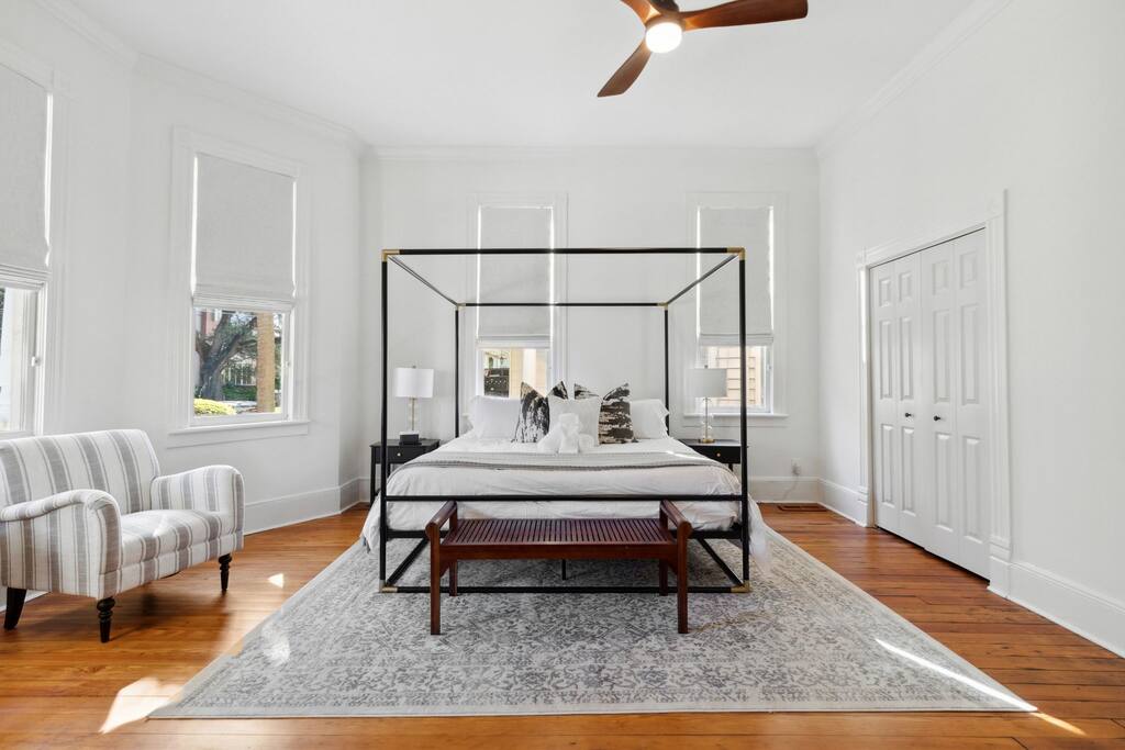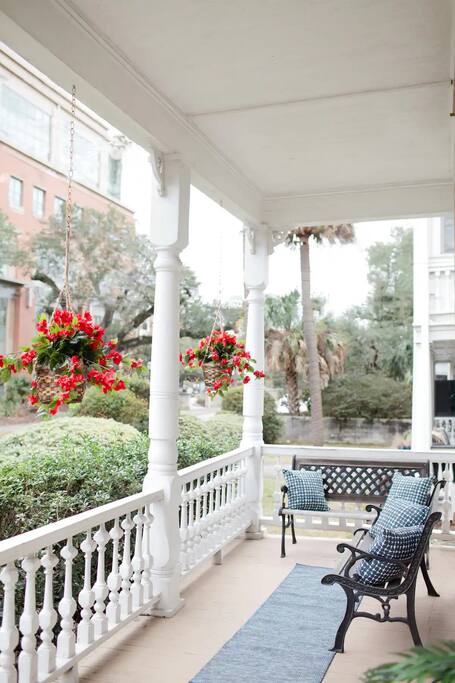 The home boasts 12 foot ceilings, original pine hardwood floors, as well as original windows, transoms and fireplaces. While the subtle imperfections of the home tell a story of centuries past, the home also includes the modern luxuries and comforts our guests have come to expect such as hotel-grade mattresses and linens, high-speed WiFi, all new appliances and high-end bathroom finishes. The bottom floor apartment is accessed through the front of the building with two reserved parking spaces located in the rear of the building. The primary bedroom includes a brand new, luxurious king bed, full-length mirror, smart TV, nightlight and smart device charger, spacious closet with extra pillows, cleaning supplies and space for all of your personal belongings as well as a desk for those needing a private workspace. Located off the hallway is a full-size washer/dryer closet with provided laundry supplies. Continue down the hall to your primary bathroom, complete with a rain and handheld shower. The main living space includes a dinette with seating for two, a Pottery Barn couch with queen sized pull-out sofa and memory foam mattress. The 55” smart TV includes a variety of free channels through Roku, or you can activate “guest mode” to access your own streaming channels and catch up on your shows. Whether you’re looking to entertain or cook a gourmet meal, the kitchen is fully stocked with everything you’d need, including plastic dinnerware for our youngest of guests. The coffee bar includes a variety of k-cups, tea bags, ground coffee from a local Charleston roaster, sugar and creamer. Take a seat at one of our locally-made, custom breakfast bars, with seating for 4. Last but not least, step foot into our second bedroom with two queen beds, hotel-grade mattresses and linens, an antique 19th century dresser, smart TV and ensuite bathroom. Ideal for families with kids, the shower/tub combo has a hinge glass door for bathing the kiddos as well as a step stool for the little ones who can’t quite reach the sink. Guests can also enjoy some time al fresco on the shared front porch. Please note, quiet hours are in effect after 10 p.m. Beach essentials such as Turkish beach towels and a cooler/beach bag combo is provided for guests to use for trips to the beach, picnics in one of the city's parks or day trips.