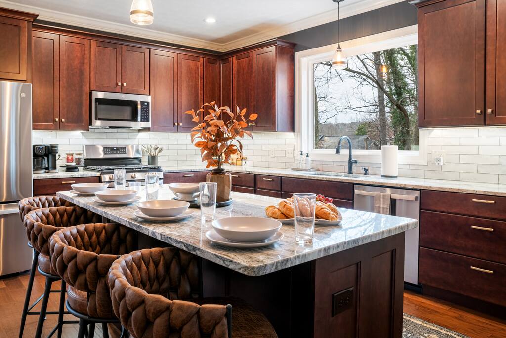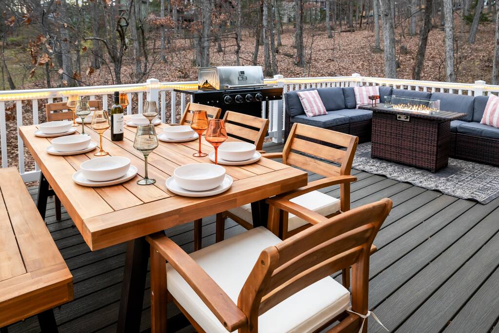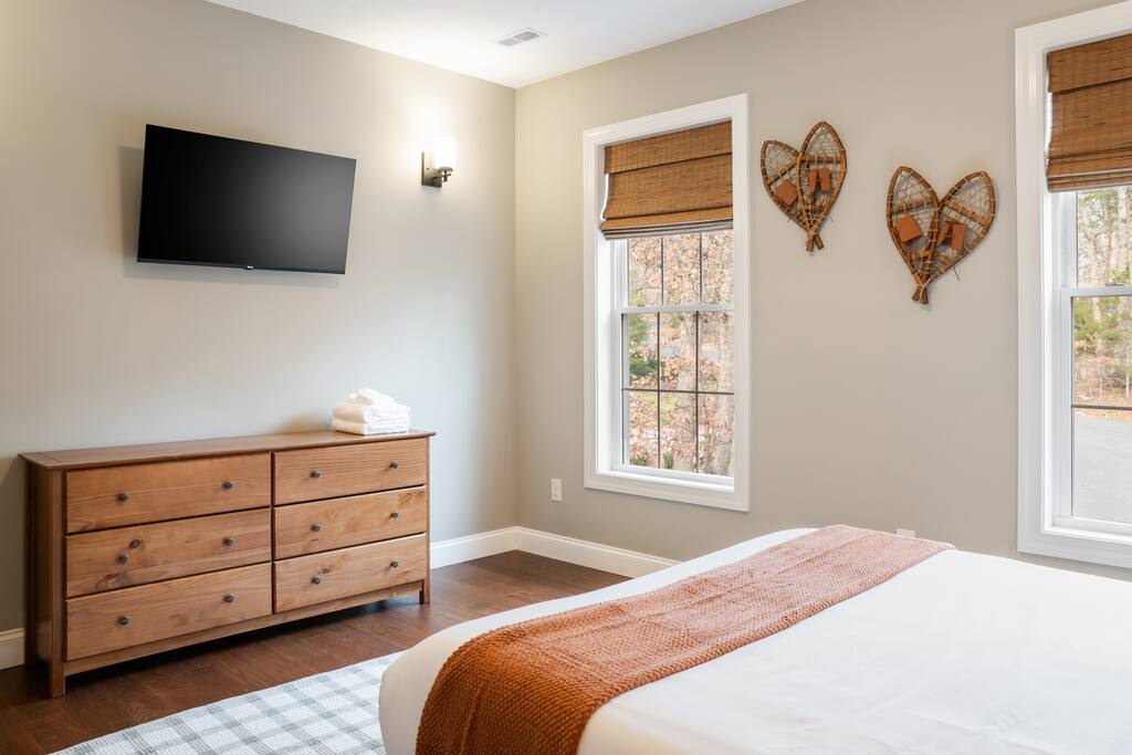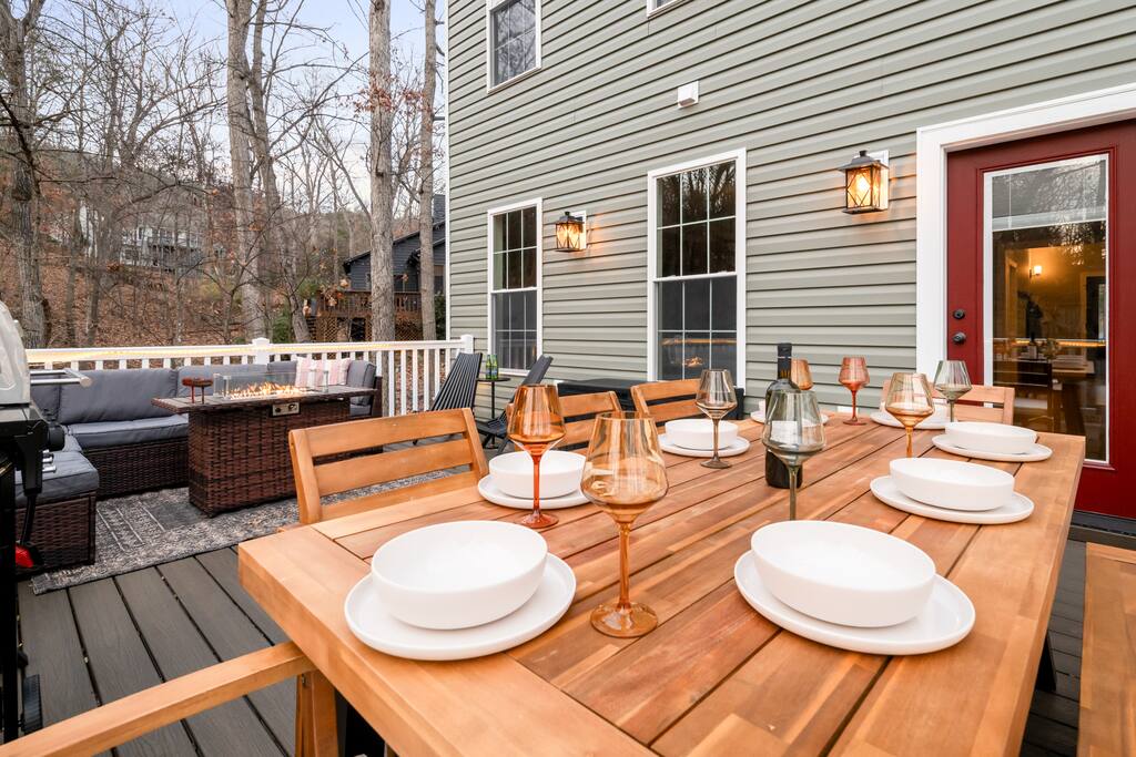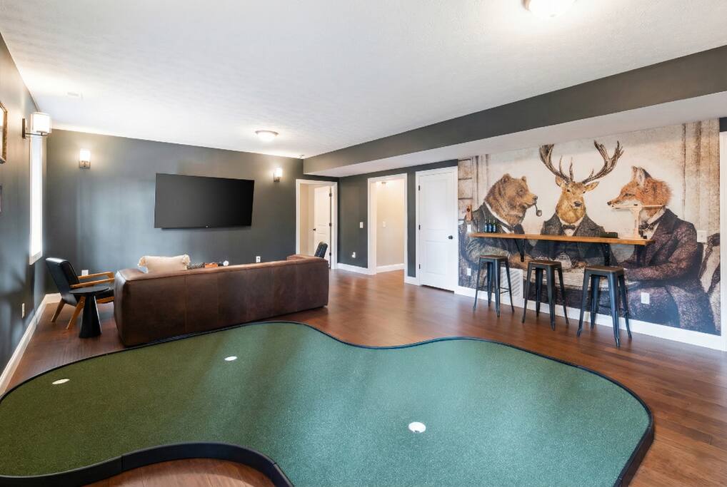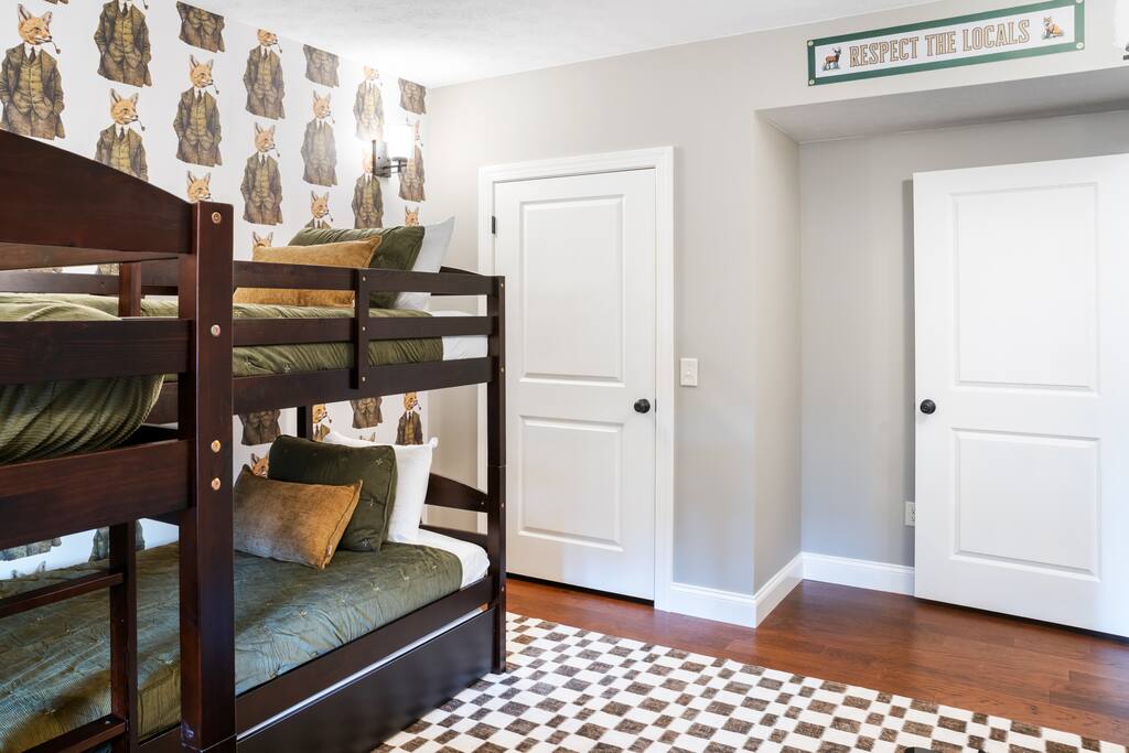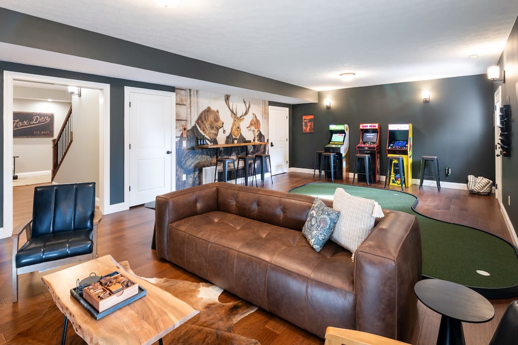Whether you choose to stay in and enjoy all of the amenities, or explore all that the resort has to offer, The Fox Den has it all! Inside, enjoy 3 levels of well-appointed bedrooms, bathrooms and living spaces, including TWO game rooms, and three en-suites on the top level, each individually curated with a different fox motif. Venture outside to enjoy three separate outdoor areas — a deck with dining, seating and a fire pet, patio with hot tub and ambient lighting, and two seating options on the covered front porch perfect for that morning cup of coffee. With close to 5,000sf of living space, guests can enjoy the following: LIVING ROOM Spacious living area that all flows together from room-to-room, this is truly the heart of the home. Highlights include: ✧ 55” Smart TV with streaming access ✧ Large, oversized sectional for ample seating ✧ Living area room with wraparound sectional for the whole family to cozy up on, an electric fireplace, and bookcases with board games ✧ Entryway with ample coat hooks and shoe storage ✧ Open flow to the kitchen and dining room KITCHEN The fully-equipped kitchen is stocked with every sort of cooking item or entertaining ware you would need for your stay, including two pantries for guest use. Highlights include: ✧ Brand new, stainless steel appliances ✧ Drip and Keurig coffee ✧ Pots, pans and a variety of small appliances and cookware ✧ Indoor and outdoor dining ware as well as kid-friendly ✧ Glasses, glasses and more glasses! Two different sets for indoor and outdoor use ✧ Kitchen island with seating for 4 ✧ Separate dining room with seating for 12 and a buffet with additional entertaining ware for more formal dining occasions PRIMARY BEDROOM Located on the second level, the large primary suite is situated at the rear of the home and includes a luxury ensuite bath — making it your personal retreat and the perfect place to unwind after a day of activities. Highlights include: ✧ King bed with hotel-grade linens ✧ Blackout shades ✧ 50” Smart TV with streaming access ✧ Dresser and closet space ✧ Extra large ensuite with jetted tub/shower combo, separate water closet, his and hers vanity ✧ Full nursery with crib, blackout shades and play area — perfect for the littlest of guests! ADDITIONAL BEDROOM AND BATHROOMS There are 5 additional bedrooms spread out across the three levels. Kids and parents alike can have their own private sanctuaries with bedrooms designed with each in mind on the top and lower levels. Highlights include: ★ Bedroom 1 (main level): Queen bed, blackout shades, dresser, 43” Smart TV, closet ★ Bedroom 2 (second level): King bed, blackout shades, desk and workspace, 43” Smart TV, closet, ensuite bath with shower/tub combo ★ Bedroom 3 (second level): Queen bed, blackout shades, dresser, 43” Smart TV, closet, ensuite bath with shower/tub combo ★ Bedroom 4 (lower level): Two Queen beds, blackout shades, dresser, 43” Smart TV, closet, wall-mounted Connect 4 ★ Bedroom 5 (lower level): L-shaped bunk beds with 4 twin beds + trundle, blackout shades, dresser, 43” Smart TV, infinity game table GAME ROOMS There are two game rooms for guest enjoyment. The lower level is a true entertainment hub complete with arcade games, putting green and bar area. On the second level, guests can enjoy a board game area with a chess table and a separate reading nook. Highlights of the lower level game room include: ✧ 4 hole putting green ✧ 3 arcade games (Golden Tee, NBA Jam, Pacman) ✧ Bar area ✧ 75” Smart TV and seating area ✧ Bluetooth speaker ✧ Bar games OUTDOOR SPACE There are three outdoor areas for your enjoyment! Whether it’s coffee in the morning, a meal in the evening, or a sunset soak, the outdoor area provides a tranquil escape on the resort. Highlights include: ✧ Hot tub with ambient lighting and towel hooks (fits 7) ✧ Propane fit pit area (seats 8) ✧ Dining table (seats 8) ✧ Propane grill ✧ Rocking chairs and glider under a covered front porch LOCATION ✔ 5 minutes to Massanutten Resort (slopes, pool, adventure course) ✔ 6 minutes for golf course(s) ✔ 6 minutes to the Indoor/Outdoor Waterpark ✔ 20 minutes from Swift Run Gap entrance of Shenandoah National Park ✔ 25 minutes to Harrisonburg & JMU ✔ Close to highway access for hiking, wineries, breweries, dining and scenic drives